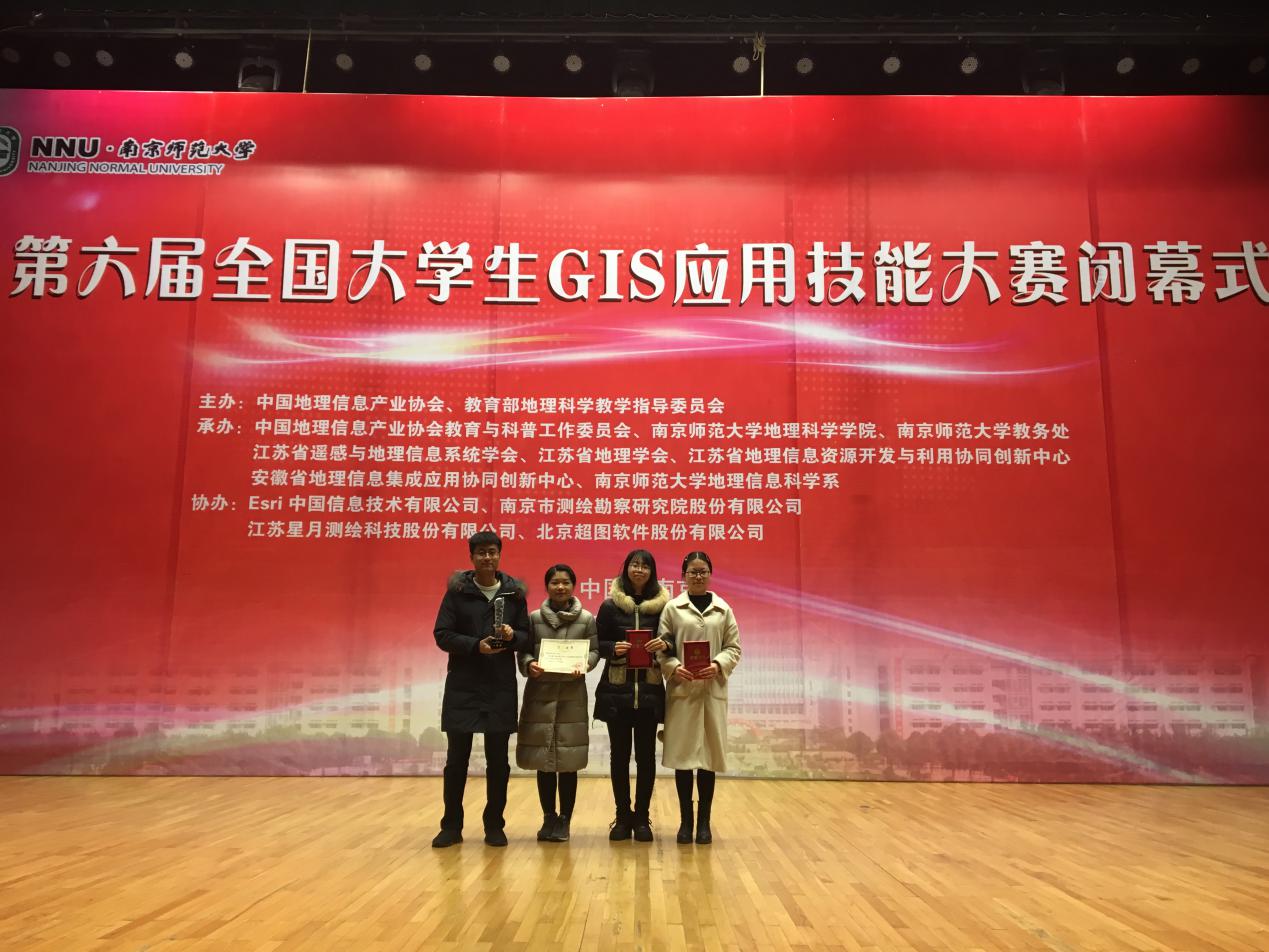 代表队在江苏南京参加第六届全国大学生GIS应用技能大赛,获得一等奖。