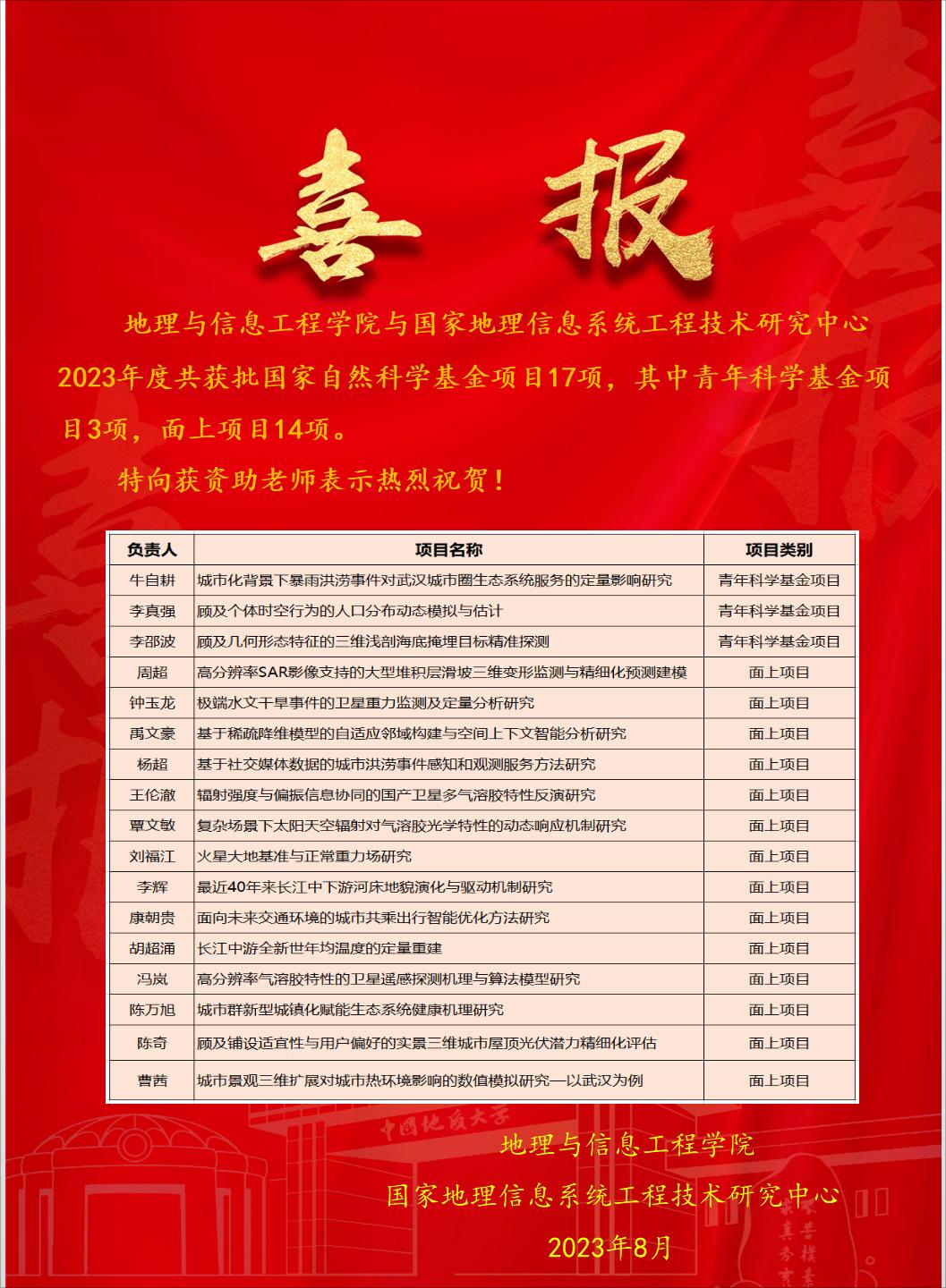 草榴社区 与国家地理信息系统工程技术研究中心2023年度共获批17项国家自然科学基金项目