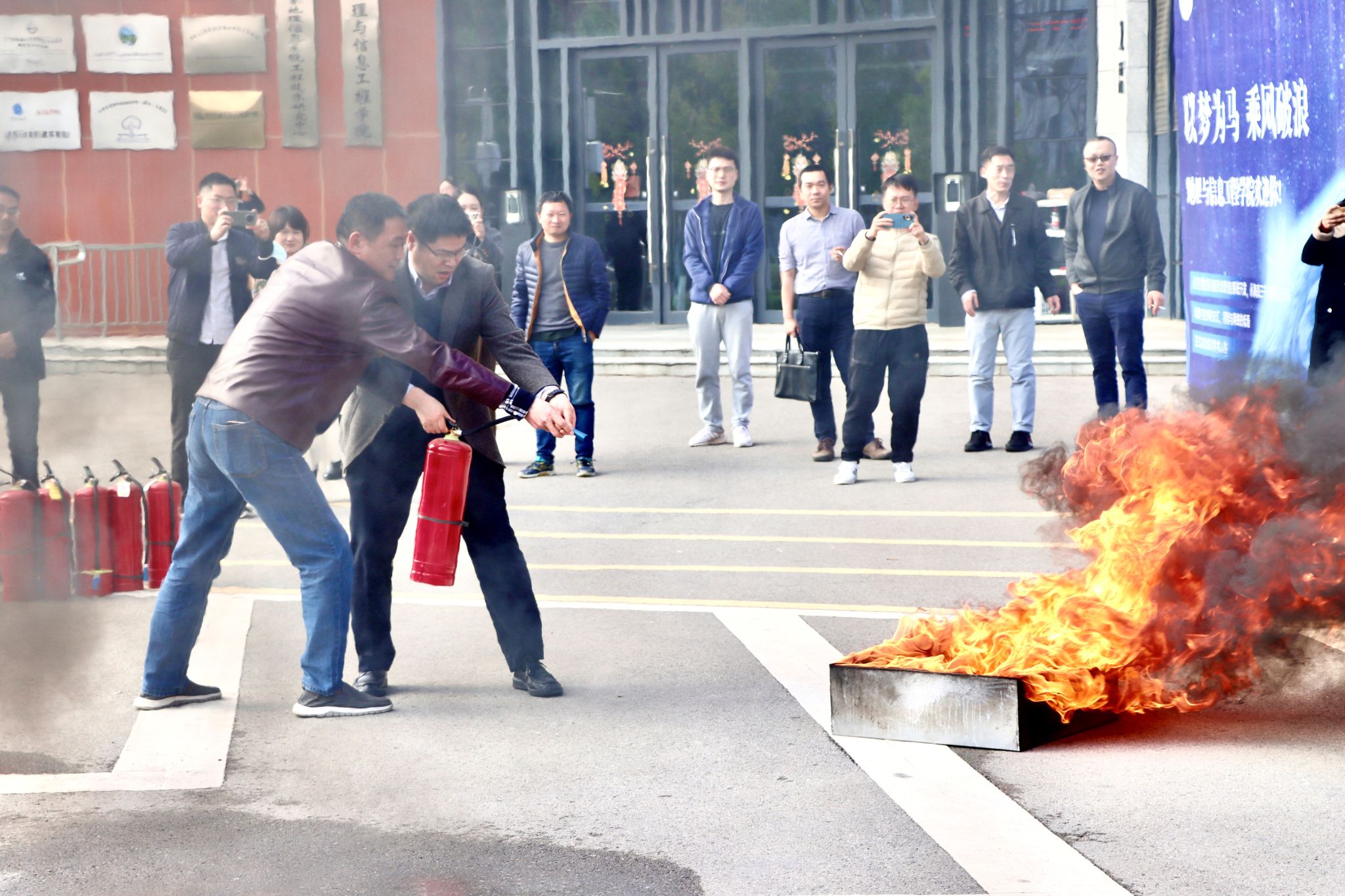 会议最后,学校安全保卫部科长张献文为全院教职工作安全教育主题讲座。参会师生在学院楼前开展消防实战演练。
