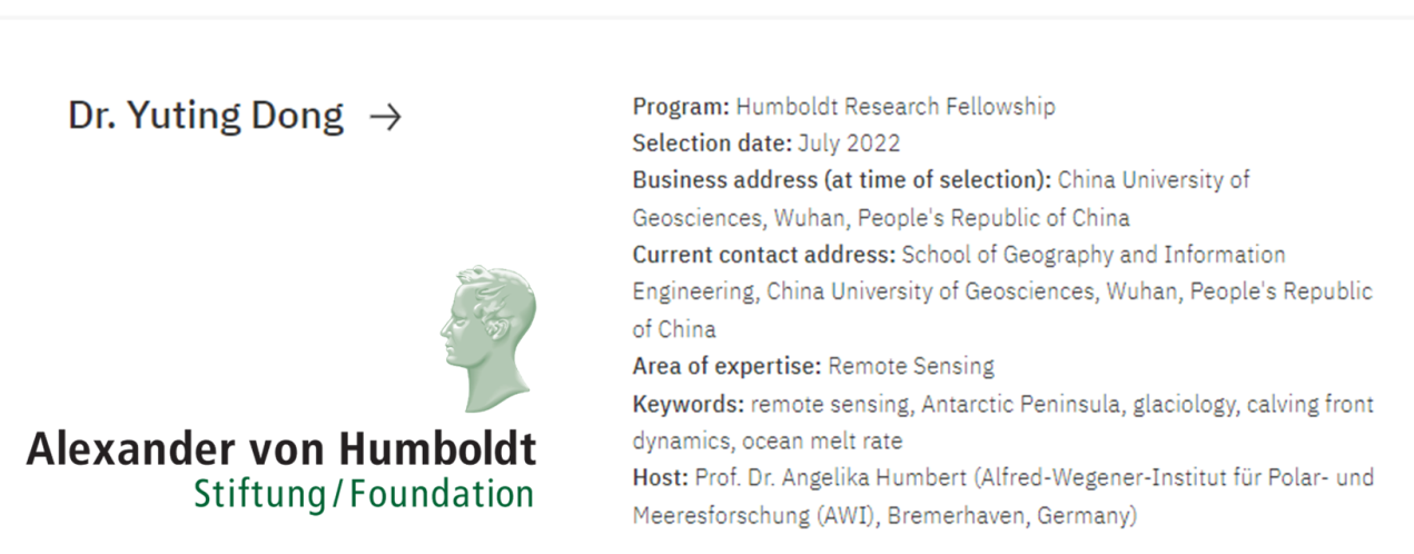 青年教师董宇婷教授获得德国洪堡基金会资助,将赴德国亥姆霍兹极地海洋研究中心(AWI)开展极地遥感合作研究,合作者为冰川学家Angelika Humbert教授。