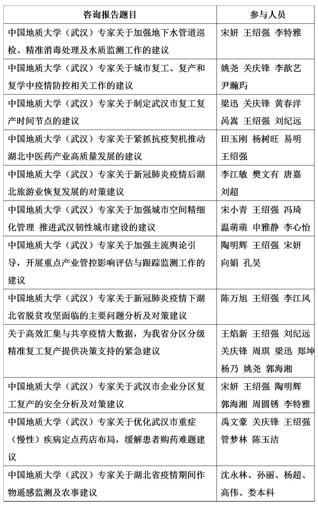 在新型冠状病毒导致的疫情发生后,学院师生在院长王绍强教授的带领下,联合中国科学院地理科学与资源研究所以及多家兄弟院校,迅速成立科技抗疫智力团队。团队运用专业知识和多源数据分析,围绕地下水管道巡检、复工复产、旅游业恢复、中医院产业发展、城市大气环境、扶贫攻坚、城市空地管理、疫情数据高效共享、武汉市药房可达性和农情遥感监测等,共撰写咨询建议报告12份并提交到武汉市和湖北省相关政府部门,得到了高度重视和赞扬。同时,团队结合学院在GIS领域的技术优势,开发出武汉市新型冠状病毒肺炎疫情态势分析系统,运用地理信息系统、智能分析模型、大数据可视化分析等技术,初步实现了武汉市新冠肺炎疫情态势的动态可视分析,受到光明日报、中国自然资源报、楚天都市报等新闻媒体的报道。