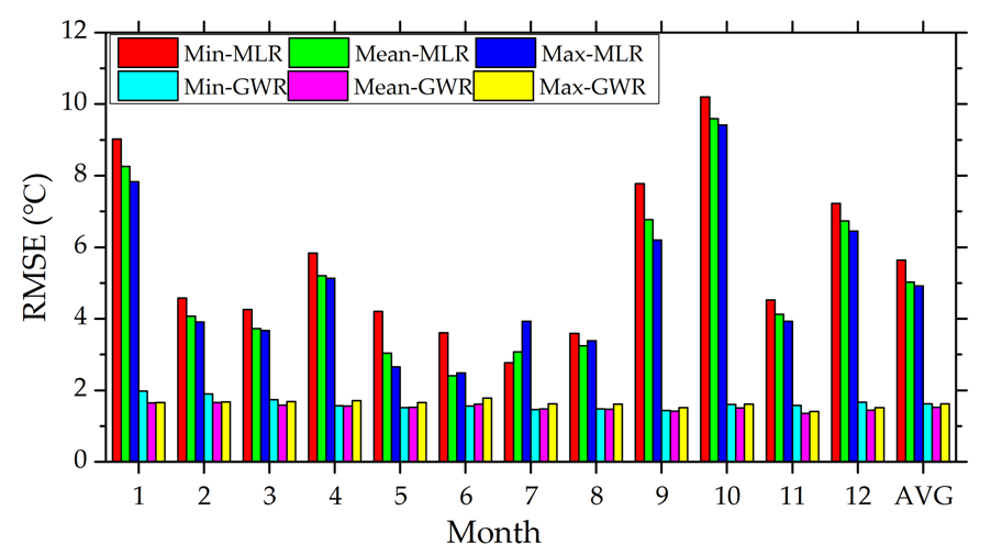 图1基于多元线性回归模型(MLR)和地理加权回归模型(GWR)的中国陆地区域2010年月度最小、平均和最大近地表气温估算精度比较; Min-MLR 表示基于多元线性回归模型的月最低气温制图,Mean-MLR 表示基于多元线性回归模型的月平均气温制图,Max-MLR 表示基于多元线性回归模型的月最高气温制图,Min-GWR 表示基于地理加权回归模型的月最低气温制图,Mean-GWR 表示基于地理加权回归模型的月平均气温制图,Max-GWR 表示基于地理加权回归模型的月最高气温制图。