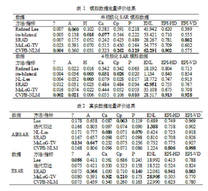 本文算法基于模拟和真实极化SAR数据分别进行了验证,通过与局部和非局部滤波方法进行对比实验表明,对于单视模拟图像,所提方法的等效视数(ENL)和大多数极化指数都达到了最优值。同时能够较好保持多视模拟数据的极化信息,功率信息和边缘细节信息。对于真实极化SAR图像,所提方法的量化指标不是最高值,然而,所提方法在相干斑滤波和信息保持性之间实现了更好的平衡,并且所获得的熵图像以及Canny检测器结果能够比其他方法更有效地区分各种地物目标。