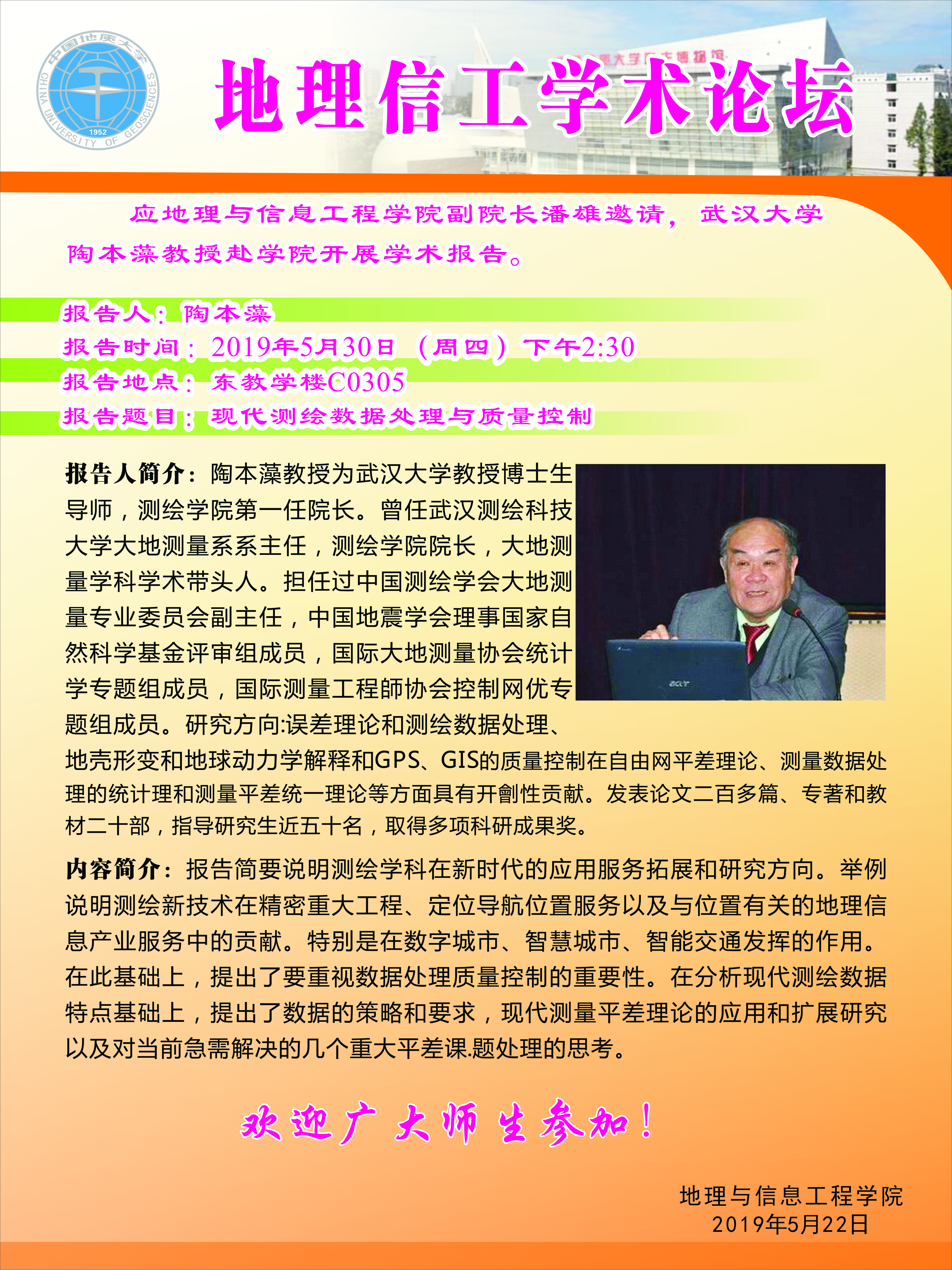 地理信工学术论坛第133期:武汉大学陶本藻教授