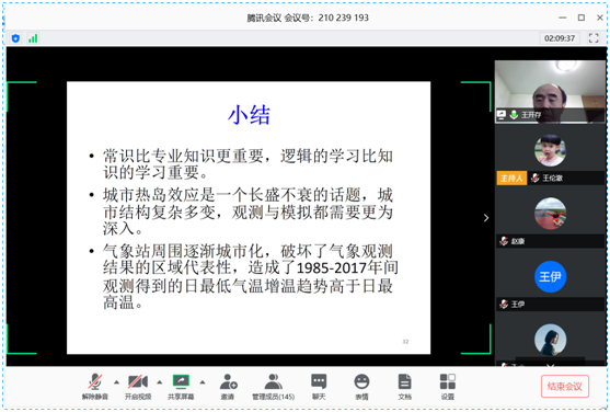 在线授课平台进行了“城市热岛效应及其对中国变暖观测结果的影响”主题讲座,本次讲座由王伦澈副院长主持,150余名师生在线聆听了讲座。