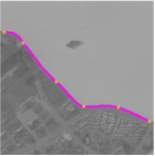 为了验证方法的有效性与适应性,基于高分二号上目视解译的参考海岸线,本文从landsat8 OLI图像中选择了5条具有不同海岸环境、不同形态、不同类型海岸线作为实验区域,算法提取的视觉效果如图1,对提取结果进行精度分析,结果如表1。其中,均方根误差(RMSE)范围为3.02米到4.77米;线匹配度(LM)范围从2.51米到3.72米,这说明本文算法对不同形态的海岸线具有一定的有效性和适用性,且具有稳定的亚像元定位精度。除此之外,本文通过比较亚像元海岸线提取结果与参考海岸线的长度,验证了算法对海岸线细节的保存性,结果如表2。