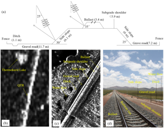 图3 (a)青藏铁路路基剖面结构示意图,(b)低分辨率Sentinel-1A, (c)超高分辨SAR图像,(d)野外照片