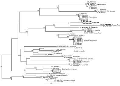 图3 神农架大九湖湿地发现的新物种Nebela jiuhuenesis Qin 2016光学显微镜照片(比例尺40微米)和构建的DNA系统发育树