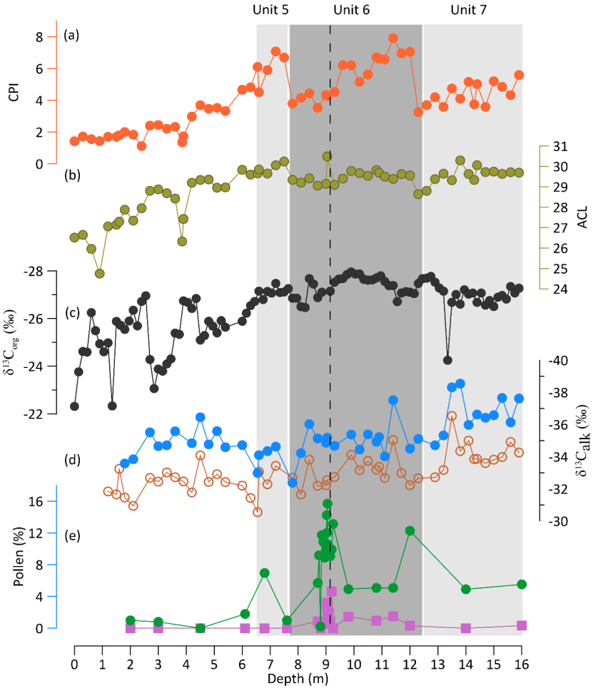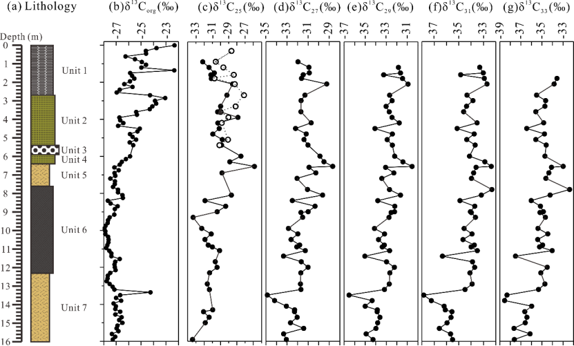 在产古猿化石的炭质粘土层以及其附近的两个褐煤层,正构烷烃及其单体碳同位素组成均显示出有机质主要以陆生高等植物贡献为主。然而,上部的浅湖相沉积则具有多重来源,主要由水生植物和细菌的贡献为主。正构烷烃的碳优势指数CPI和平均碳链长度ACL的变化均与岩性有关。但是,与ACL相比,CPI不仅表现出更大的变化幅度,同时在岩性转变的界线处发生突变。值得注意的是,在产古猿的时期,长链正构烷烃及其单体碳同位素组成并没有与孢粉记录中禾本科植物的增加呈现出一致的变化。出现该不一致的现象可能是由于孢粉和正构烷烃具有不同的来源导致的。我们的研究结果清楚地证明了这些基于有机质的指标具有记录古湖泊沉积物中古环境变化的潜力。