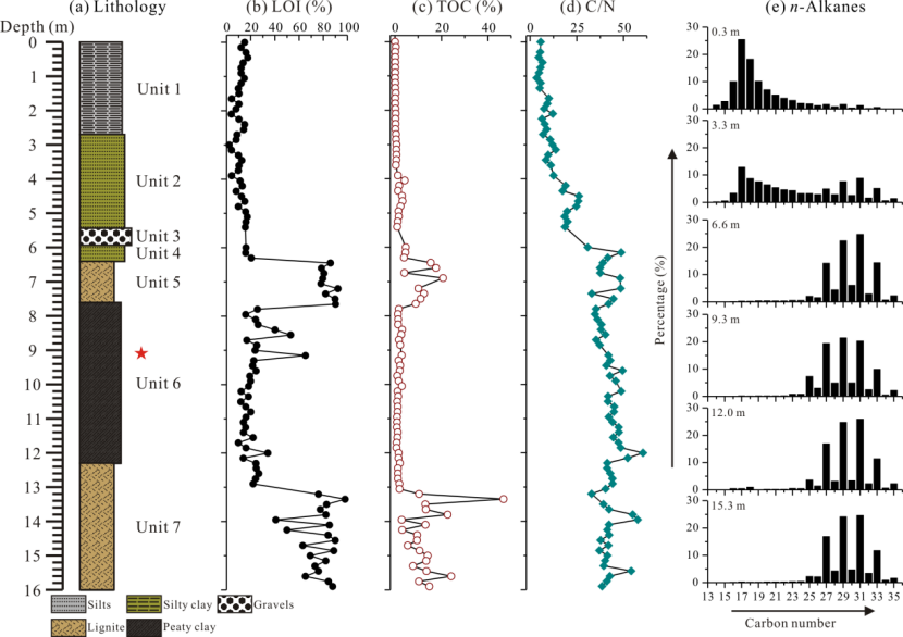 图1. 昭通盆地水塘坝露头剖面岩性(a),烧失量LOI(b),总有机碳含量TOC(c),C/N比值(d),具有代表性的样品的正构烷烃分布直方图(e)。红色五角星代表产古猿化石的层位。