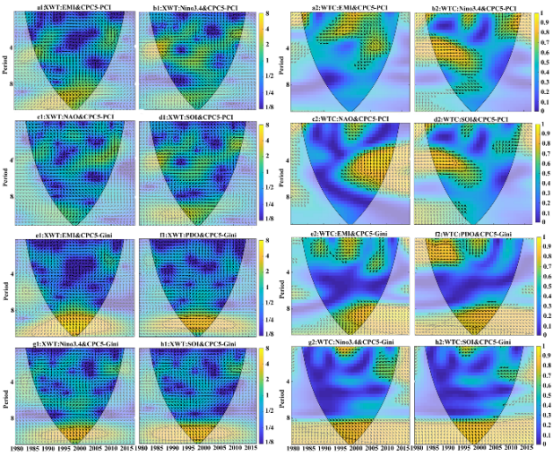 图 5 遥相关指数与中亚降水集中度的交叉小波分析