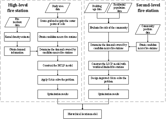 消防应急服务是城市公共卫生和安全体系的重要组成部分,其布局合理性直接影响救灾响应的效率。与一般的公共服务相比,城市消防服务具有特定响应时间、覆盖需求最大化、工作负载均衡和成本最小化等特点。一般的设施选址只考虑其中的单个方面;此外,传统研究将所有消防站建模为同一层次,未考虑消防服务系统的多层次结构。我国公共应急服务机构提出了一系列优化举措,通过设置具有不同能力的消防站来建立分级消防服务体系。相比于常规消防站,微型消防站对人力、物力、财力消耗少,救援响应时间短,服务灵活方便;微型消防站是常规消防站的有力补充。在此背景下,本文提出了一种基于不同层次的消防设施选址模型(图1)。