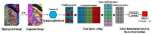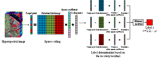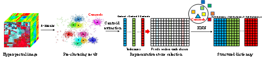 接下来,介绍第二种方法,稀疏聚类方法(Sparsity-based clustering)。相比于子空间聚类方法,我们借鉴高光谱分类思想,将大规模像素点集的图优化问题转化为逐像素优化求解问题,从而大幅降低了模型的计算复杂度和时间成本。同时,我们沿用子空间思想,将每个目标像素仅由其同子空间中原子进行稀疏重构,以准确建模高光谱数据的内部结构和光谱变化。在稀疏表达的理论框架下,我们提出两种具体的稀疏聚类模型,分别为稀疏编码聚类模型(sparse coding-based clustering SCC)和联合稀疏编码聚类模型(joint sparse coding-based clustering JSCC)。首先,在没有任何训练样本和先验知识的条件下,充分挖掘聚类中心的类别指示性,利用k-means对影像进行预聚类,结合 K最近邻方法,依次选择离各聚类中心最近的k个像素,构建结构化字典,用于像素稀疏编码,如图5所示。其次,借助结构化字典,构建稀疏编码模型,求解每个目标像素的稀疏编码系数,通过挖掘编码系数潜在的结构模式,根据最小残差准则,实现像素的类别划分。最后,考虑到稀疏编码模型仅利用影像光谱信息,判别能力有限,通过引入超像素邻域,构建联合稀疏编码模型,自适应探究邻域像素稀疏表达的共性特征,促进邻域像素共享相同的稀疏基及系数稀疏模式,同时耦合影像空间信息辅助光谱分析,从而进一步提高聚类精度。