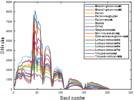 ,具有224个光谱波段,3.7m空间分辨率,共16种典型地物,其中包含较多的植物亚类,光谱相似度较高,如图3所示,给聚类分析带来较大挑战。