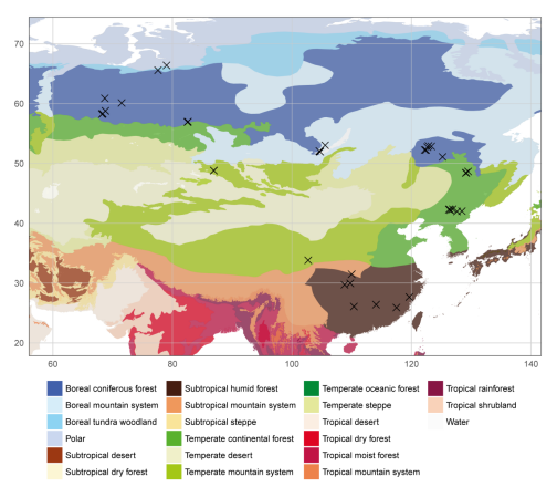 、东北师范大学、莫斯科大学、俄罗斯科学院气候变化和生态系统西伯利亚监测站,以及约克大学等十多个科研机构。该研究历时约十余年,收集了亚洲地区东起勘察加半岛-远东地区和兴安岭-长白山区一线,西至贝加尔湖-西西伯利亚的广大地区,北起亚北极圈,南至中国南方亚高山湿地群,采集样品近3000余份,覆盖了亚洲泥炭湿地的大部分区域(图1)。