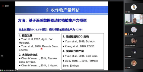 11月3日,应草榴社区 王伦澈、王绍强教授邀请,中山大学大气科学学院袁文平教授做客草榴社区 第53期名家论坛暨校庆七十周年学术交流会,以线上形式作题为“基于遥感数据的农作物种植面积制图与产量估算研究”的学术报告,受到师生的广泛欢迎。报告由王伦澈教授主持,线上、线下与会人数共计逾300人。