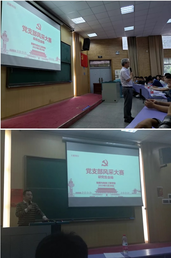 地理与信息工程党支部风采大赛在教三楼110、111教室拉开帷幕。地理信工学院党委书记许德华老师、党委副书记武彦斌老师、学工处徐伟老师、校团委霍少孟老师等莅临现场指导工作,学院各年级百余位同学参与大赛的评审和观看。