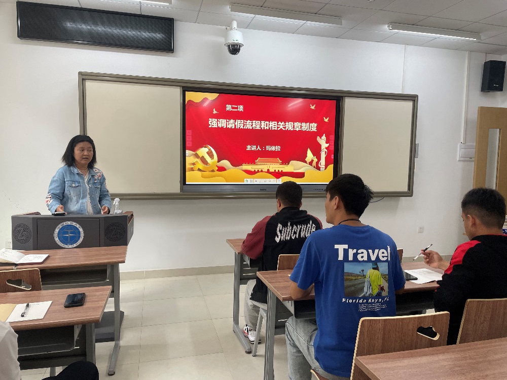 请销假流程和相关规章制度。她详细介绍学院的请销假制度、流程、实习报备、在外居住情况报备等内容。针对大四学生,玛依拉老师提醒同学们多关注就业信息,积极参与学校安排的招聘宣讲,鼓励同学们把精力放在学业上,争取顺利毕业。
