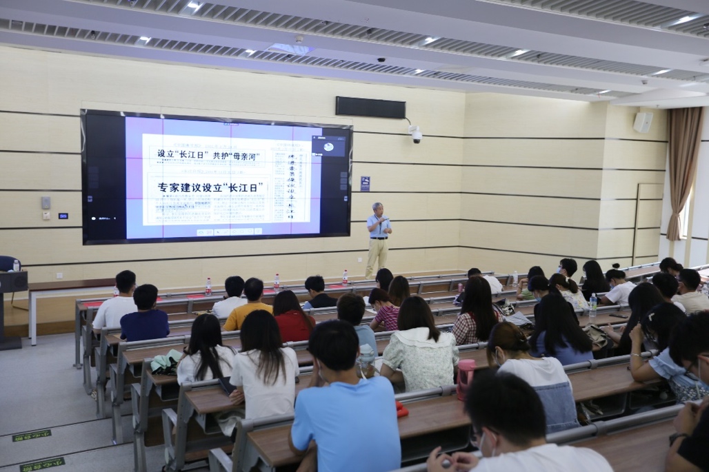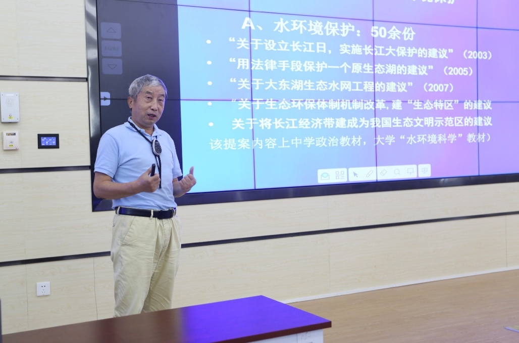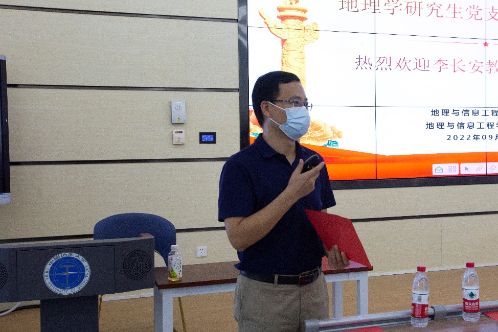李长安教授首先对地理学的学科组成和重点研究方向作出介绍,以此引入地理人的职责所在,即通过所学的专业地理知识保护生态文明。接下来李长安教授结合自己的科研经历及承担的社会责任,进一步解读了生态文明建设为什么是地理人的使命。他强调在建设生态文明的过程中,最重要的是“三真”——真情实意、真凭实据、真知灼见。李长安教授讲述了自己从地震学方向转向长江研究的过程,他出于对生态环境的关注、凭着对生态保护事业的一腔热忱,从实际出发,通过实地考察、遥感勘测等调查手段获取最真实可靠的数据与信息,提出了河流、湖泊及山体保护等一系列建议和议案,并受到国家和政府的高度认可。李长安教授在会上号召在座的党员同志,从我做起、从保护校园环境做起,切实为生态文明建设贡献出自己的力量。